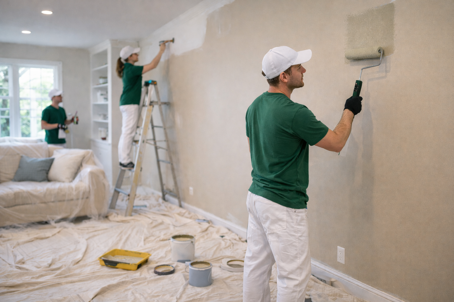 Our painting process begins with proper preparation to ensure a clean and long lasting finish. This includes surface cleaning, minor repairs, sanding, and protecting surrounding areas with drop cloths and coverings. We use quality paints and proven application techniques to achieve even coverage and a professional finish on walls, ceilings, trim, and other surfaces.